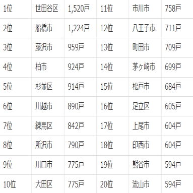 首都圏トップは世田谷区の1,520戸、2位は船橋市の1,224戸でした。首都圏で1,000戸を超えているのはこの2エリアだけで、他を大きく引き離しています。
